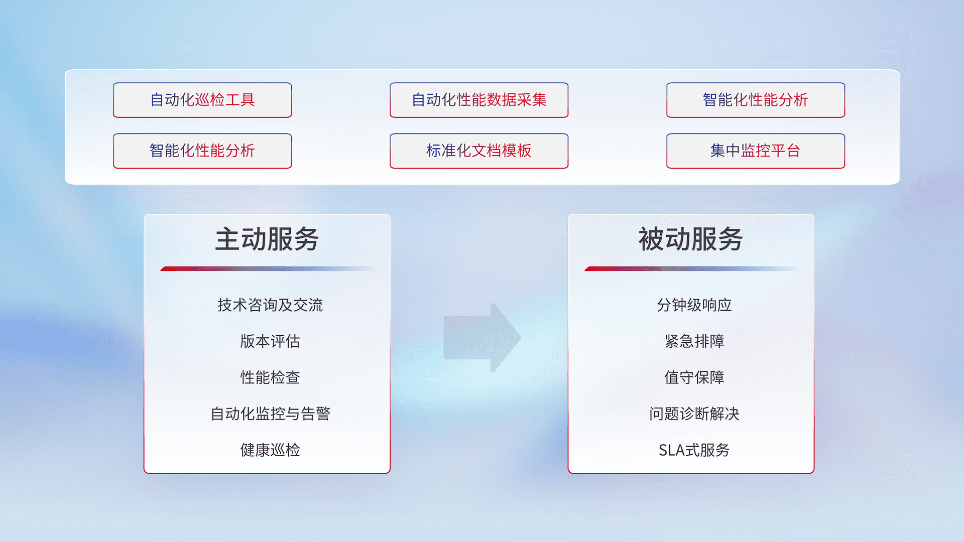 智能化工具和标准化文档,,,,保障服务质量,,,,提供主动服务(包含技术咨询、、、、版本评估、、性能检查、、、、自动化监控与告警、、健康巡检)和被动服务包含(分钟级响应、、、、紧急排障、、、、值守保障、、、、问题诊断解决、、、、SLA服务)。。